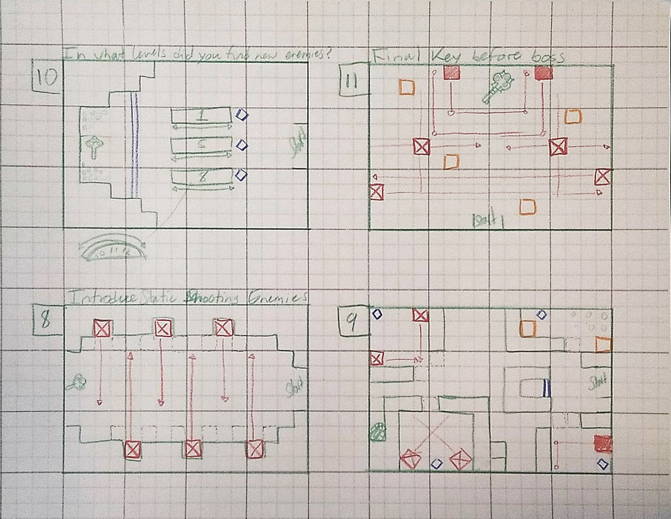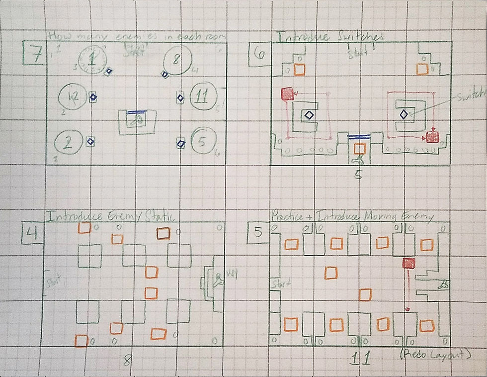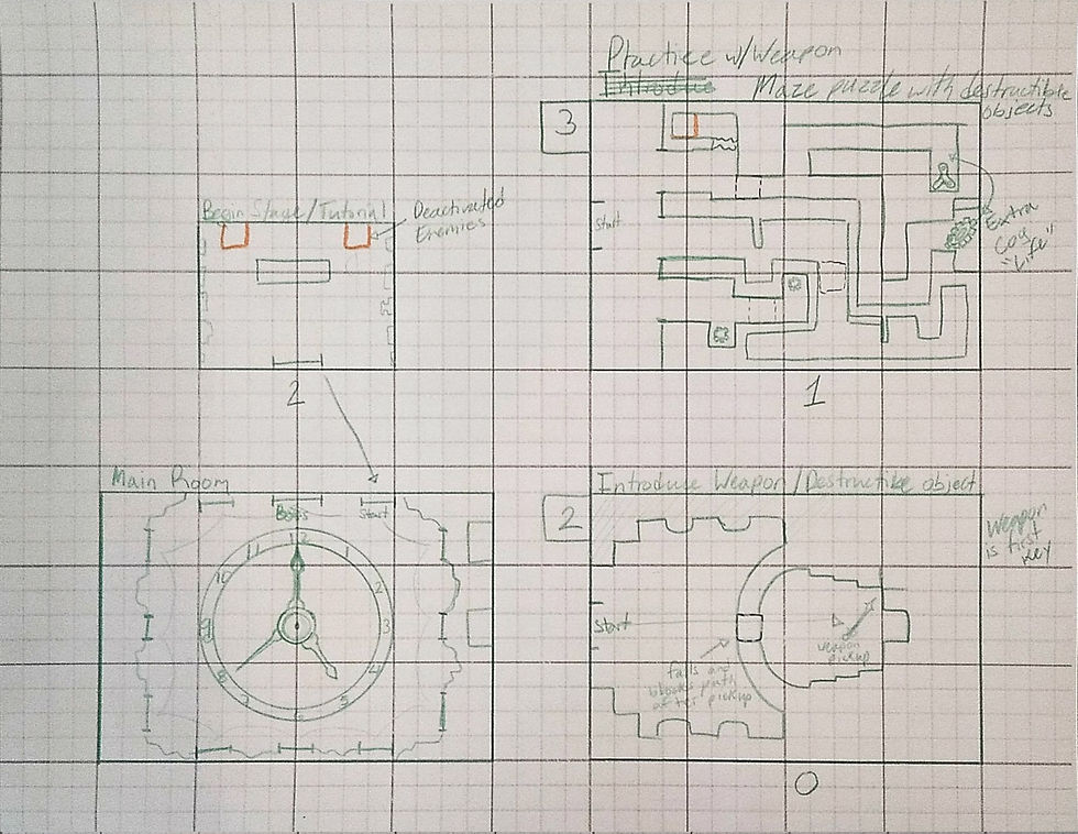 My next task in Game Design II is to create a top-down adventure game, and the first step is to design the first draft of the level layout, level mechanics, and character design around a theme. Mine is a time/clock theme, therefore there will be 12 rooms, 13 total counting the main level. The story is that your clock-smith has been kidnapped by someone, and they've gone into hiding in room 12. You, a humble and newly repaired antique clock take the initiative and journey to save your master. However, room 12 is locked, as well as all the others except 1. You begin in room 1, where the first key is, easy to obtain. Once you exit, to appear in the main room, where you realize your key unlocks only room 2. Once you enter room 2, you see that there is a key that doubles as a weapon. This continues as you make your way through the rooms, each one containing the key to the next room in numerical order. Bellow are the first pass rough drafts I've designed. These will have to be updated before going into the greybox phase of the level.